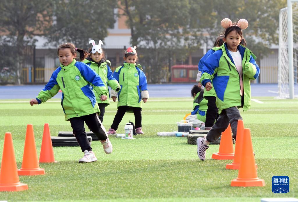 1月11日,在合肥市梦园小学教育集团枫林路学校,学生在参加美术结合体育的测评项目。