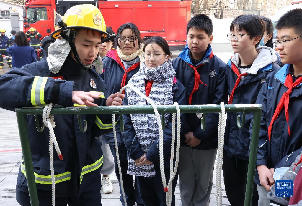 1月12日,消防员示范火场救生绳结的操作方法。