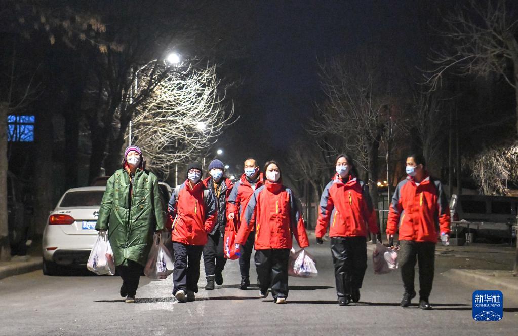 1月20日,天津市第三中心医院一组核酸采样医务人员在黎明时步行前往所负责的核酸采样点。新华社记者 孙凡越 摄