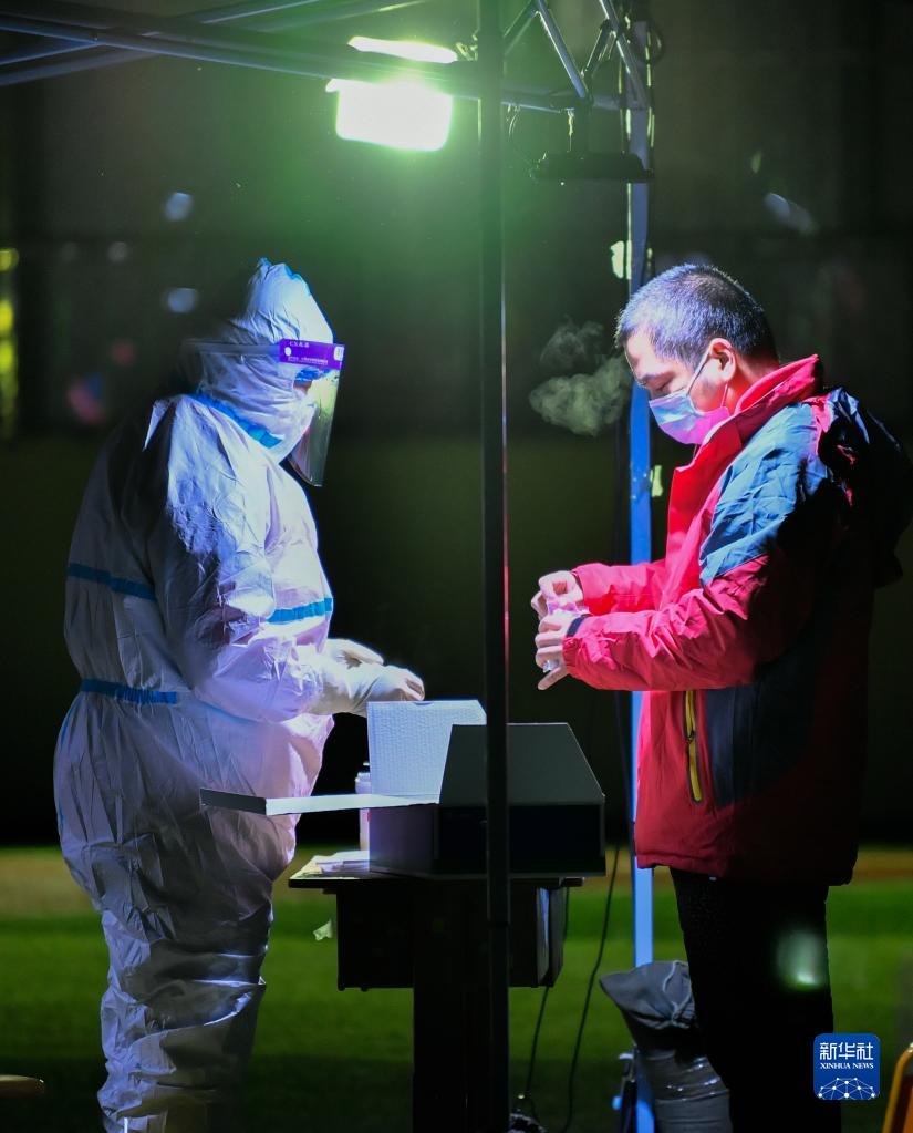1月20日,在天津市河东区冠云小学核酸检测点,工作人员在采样前准备采样器材。新华社记者 孙凡越 摄
