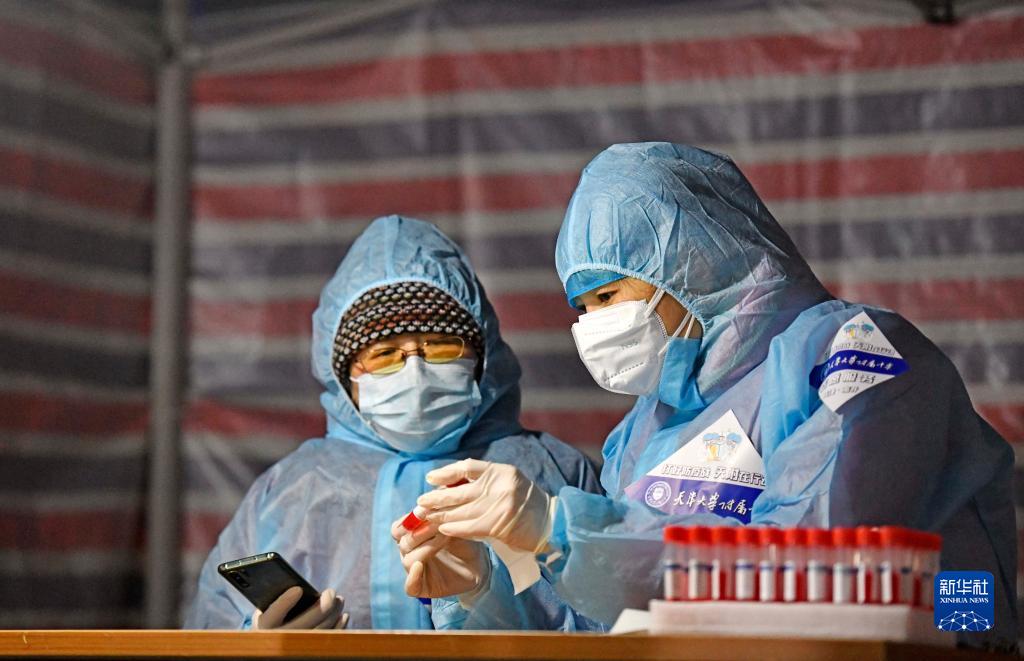 1月20日,在天津市南开区南大西南一社区核酸检测点,工作人员在为核酸检测做准备。新华社记者 赵子硕 摄