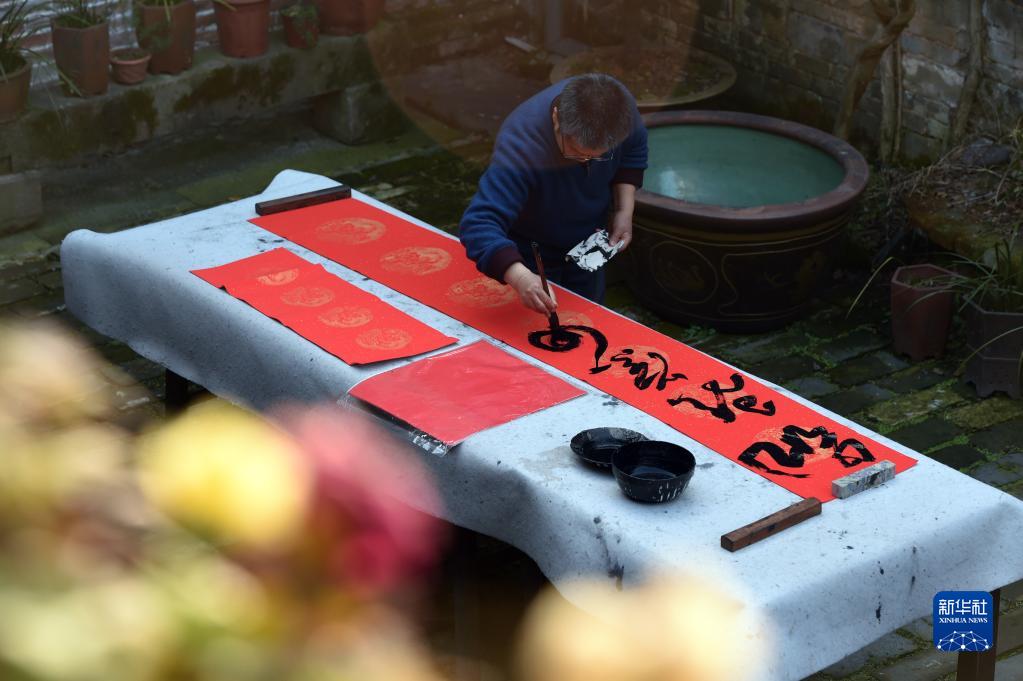 黄山市徽州区西溪南镇的居民在写春联(1月19日摄)。