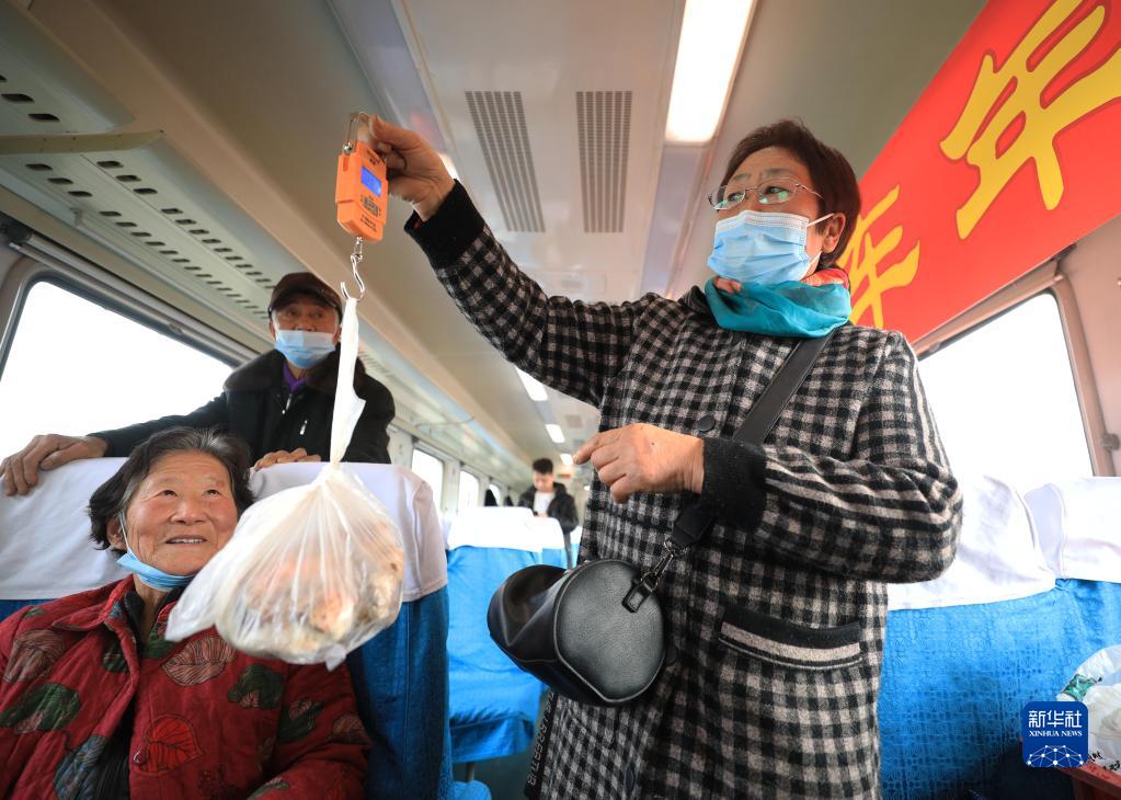1月15日,在4318次列车上,一名农民给旅客购买的猪肉称重。这是一辆行驶在东北东部山区的慢火车。为助力乡村振兴,中国铁路沈阳局集团有限公司吉林客运段在列车上开办“年货大集”。沿线各村镇的农民不用等到进城,就可在车厢里售卖自家山货。