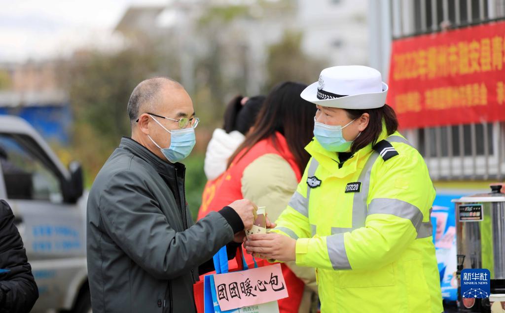 1月17日,在209国道广西柳州市融安县段“春运爱心驿站”,交通辅警为司乘人员送姜糖茶。