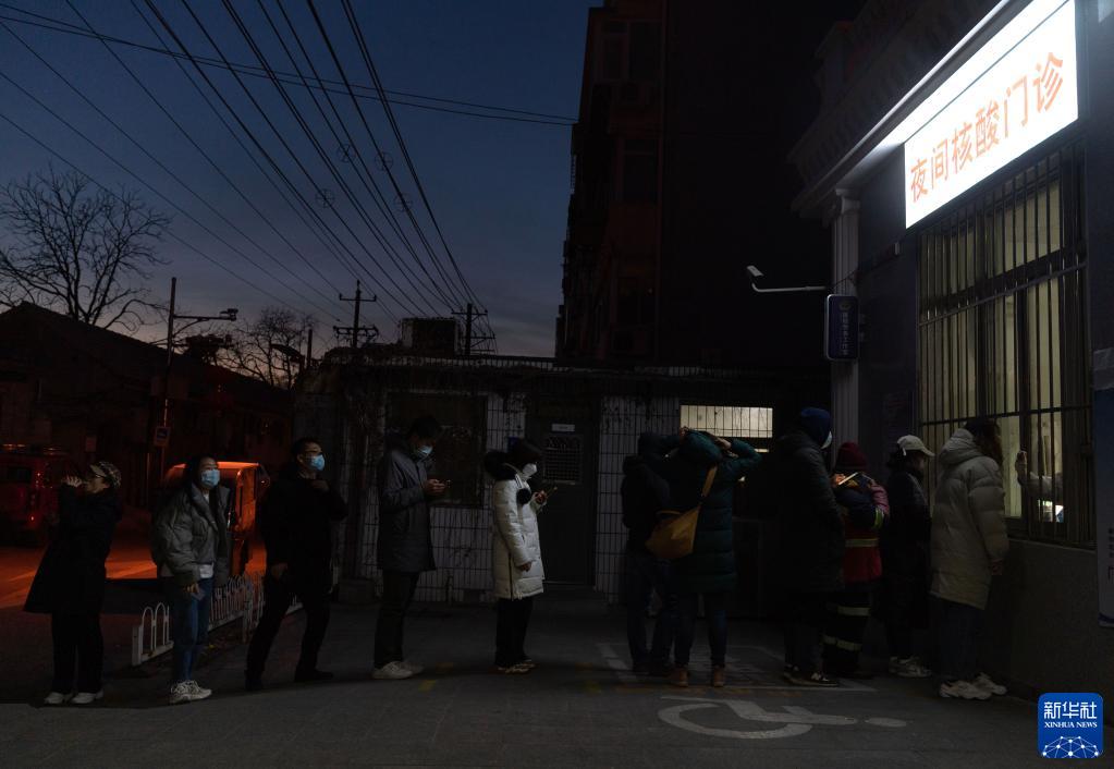1月27日晚,在北京市第六医院24小时核酸检测门诊,市民排队等候核酸采样。
