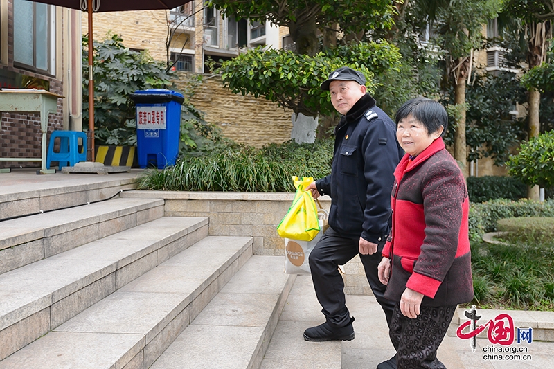 自贡新城物业有限公司总经理助理、党支部书记胡世友(右)一行走访小区业主(摄影 廖志全)