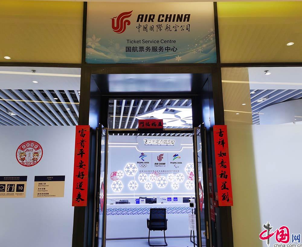 每天6点10分起床洗漱收拾,6点50分做核酸、过安检,然后乘坐班车前往北京冬奥村。国航的票务中心在冬奥村的下沉广场,“冬奥村里所有门店的门牌风格都很统一,每当远远看到在对联、窗花映衬下票务中心门眉上的国航标志,我总是莫名的有些激动。”蒋雨睿说,她也很喜欢这些对联和窗花,“配得很好看,充满新年气氛,还有人特意来拍照。”