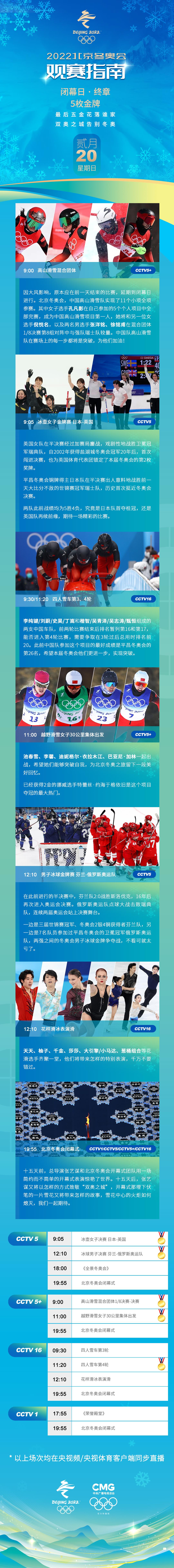 2月20日,2022年北京冬奥会最后一个比赛日,将产生5枚金牌。闭幕日最后五金花落谁家?