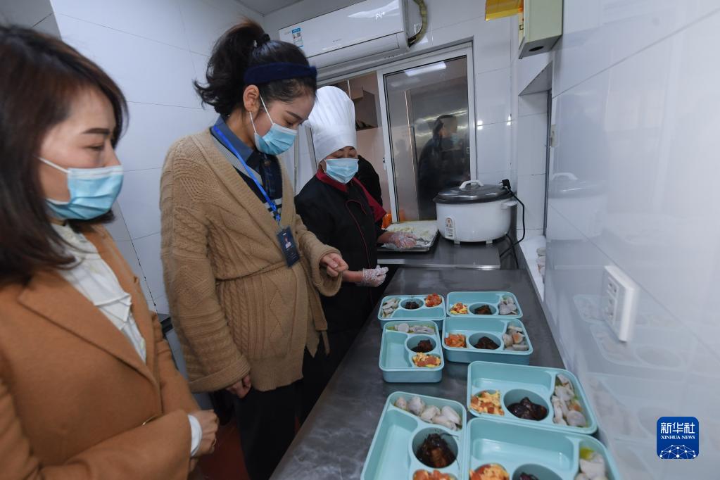 3月2日,浙江省湖州市吴兴区龙泉街道“啄木鸟”纪委监督团的监督员(左一、左二)对老年食堂的菜品、价格及服务进行检查。