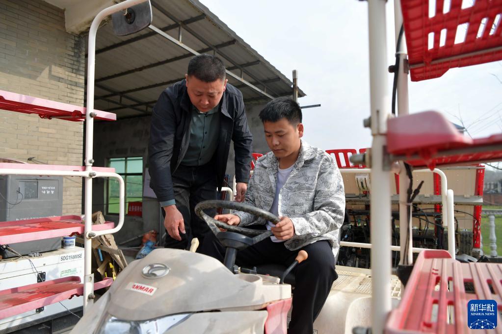 在江西省南昌县冈上镇晋安村,辜道朋(左)和儿子辜秉发一起测试一台刚修复的插秧机(3月5日摄)。