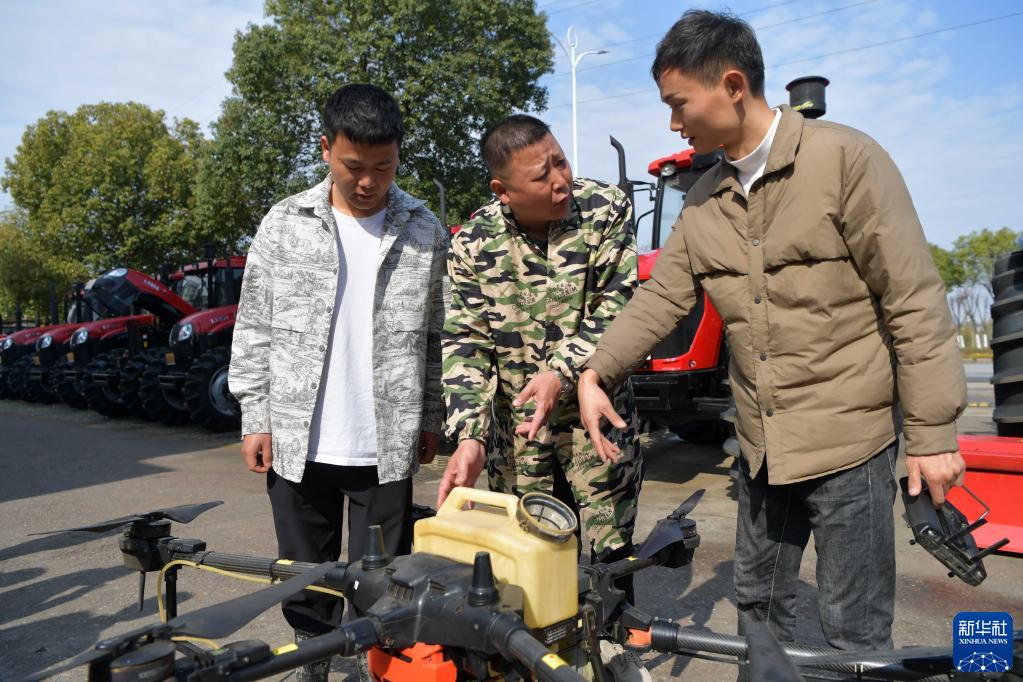 在江西省南昌县农机大市场,辜道朋(中)和儿子辜秉发(左)在了解一款无人播种机(3月5日摄)。