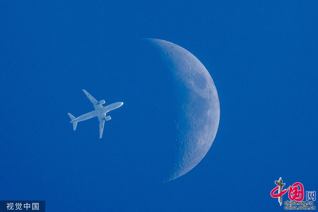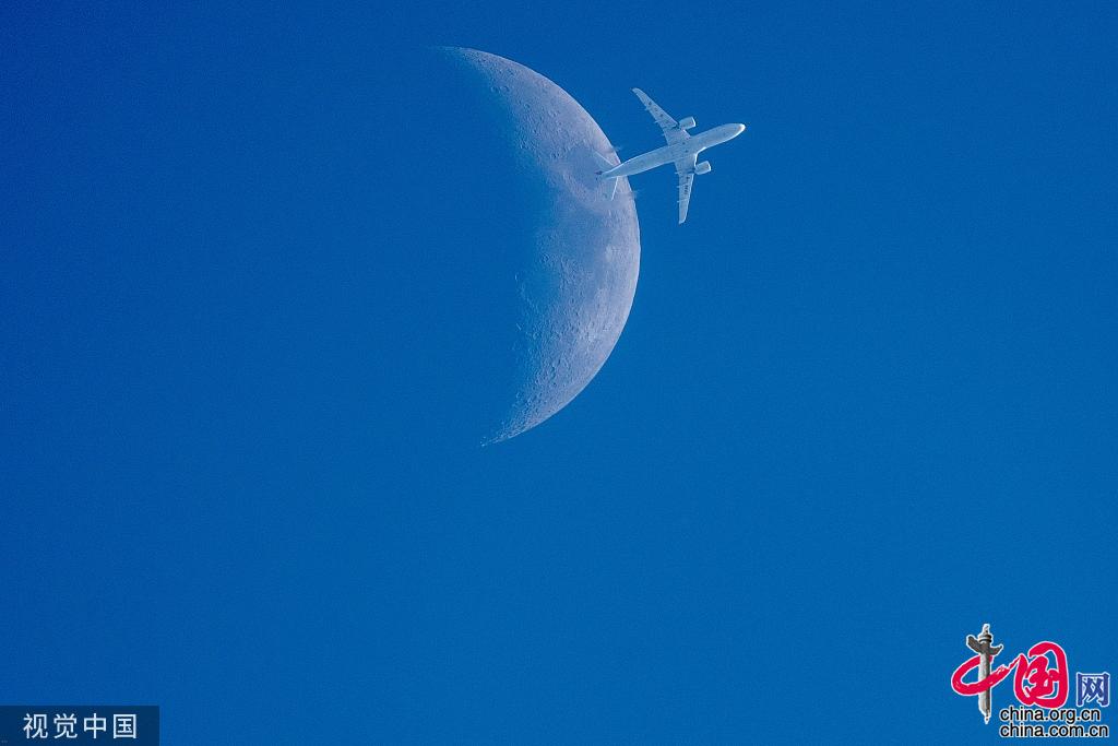 2022年3月8日,武汉,一架飞往成都的四川航空飞机穿月而过。图片来源:视觉中国