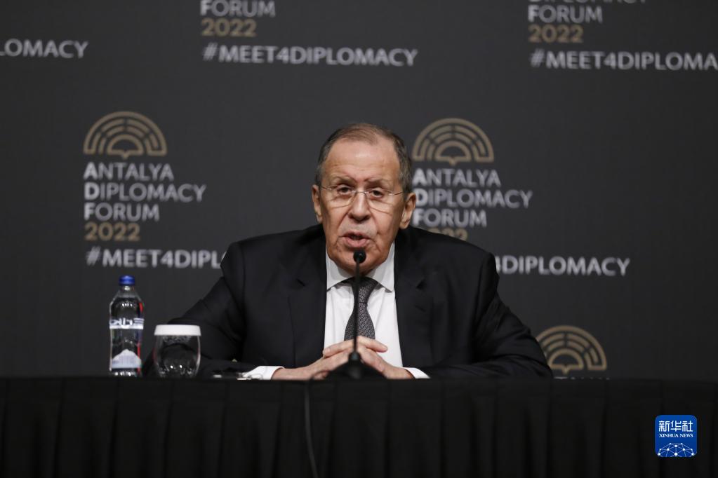 3月10日,在土耳其安塔利亚,俄罗斯外长拉夫罗夫与乌克兰外长库列巴(未在画面中)会谈后召开新闻发布会。新华社记者 李振北 摄