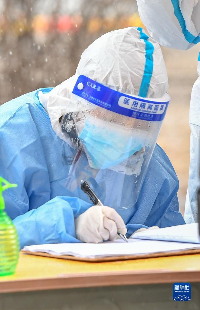 3月12日,在吉林市天鸿嘉园小区,工作人员为居民进行核酸检测采样登记。