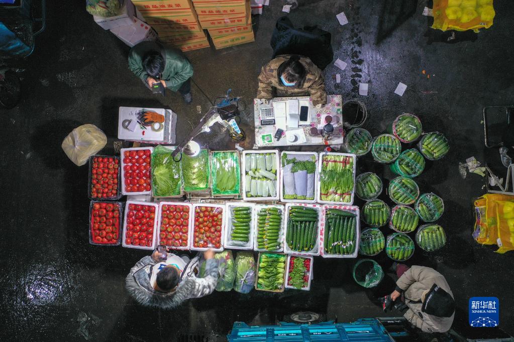 3月15日,商户在吉林市东北亚农产品批发市场销售蔬菜(无人机照片)。