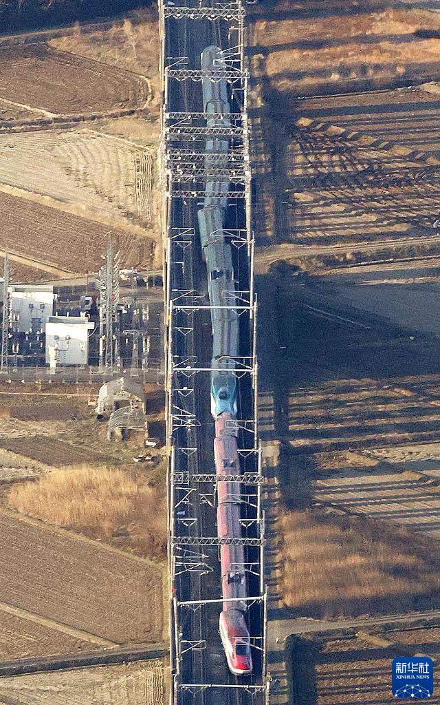 这是3月17日在日本宫城县白石市拍摄的因地震脱轨的东北新干线车体。日本福岛县附近海域16日夜间发生的地震已造成4人死亡、97人受伤。新华社/共同社