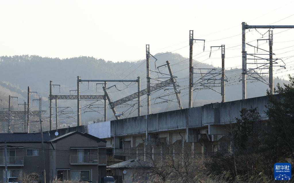 这是3月17日在日本宫城县白石市拍摄的因地震倾倒的东北新干线电线杆。日本福岛县附近海域16日夜间发生的地震已造成4人死亡、97人受伤。新华社/共同社