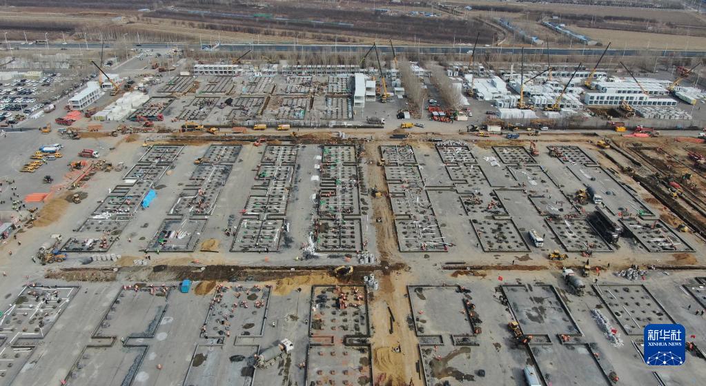 3月22日,在沈阳国际展览中心,各施工单位加紧建设健康驿站(无人机照片)。