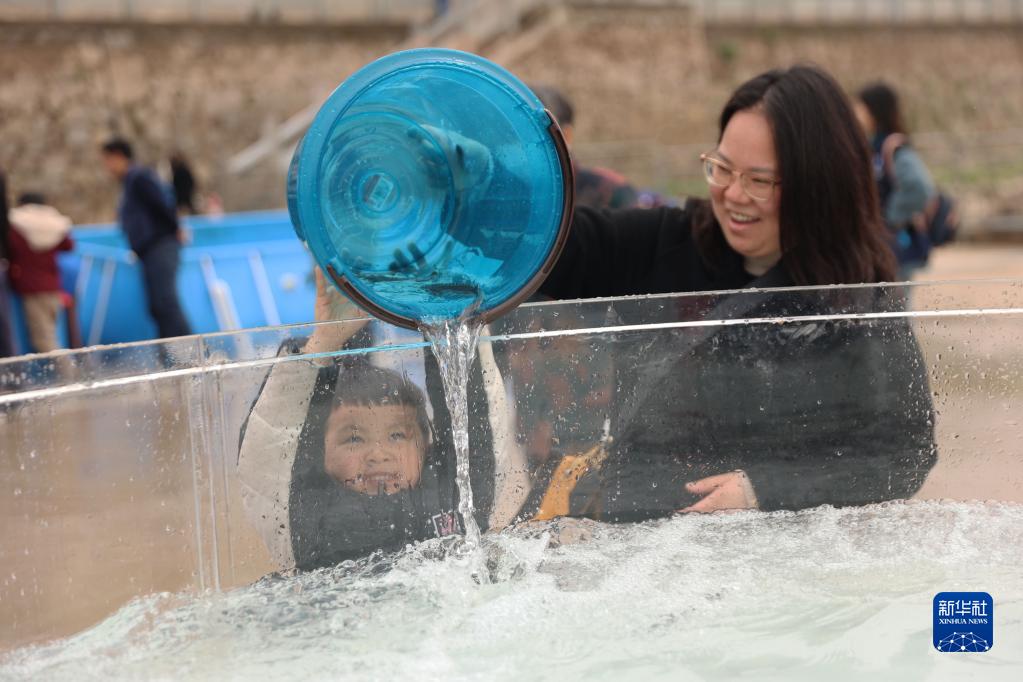 3月26日,人们在湖北宜昌向长江中放流中华鲟。