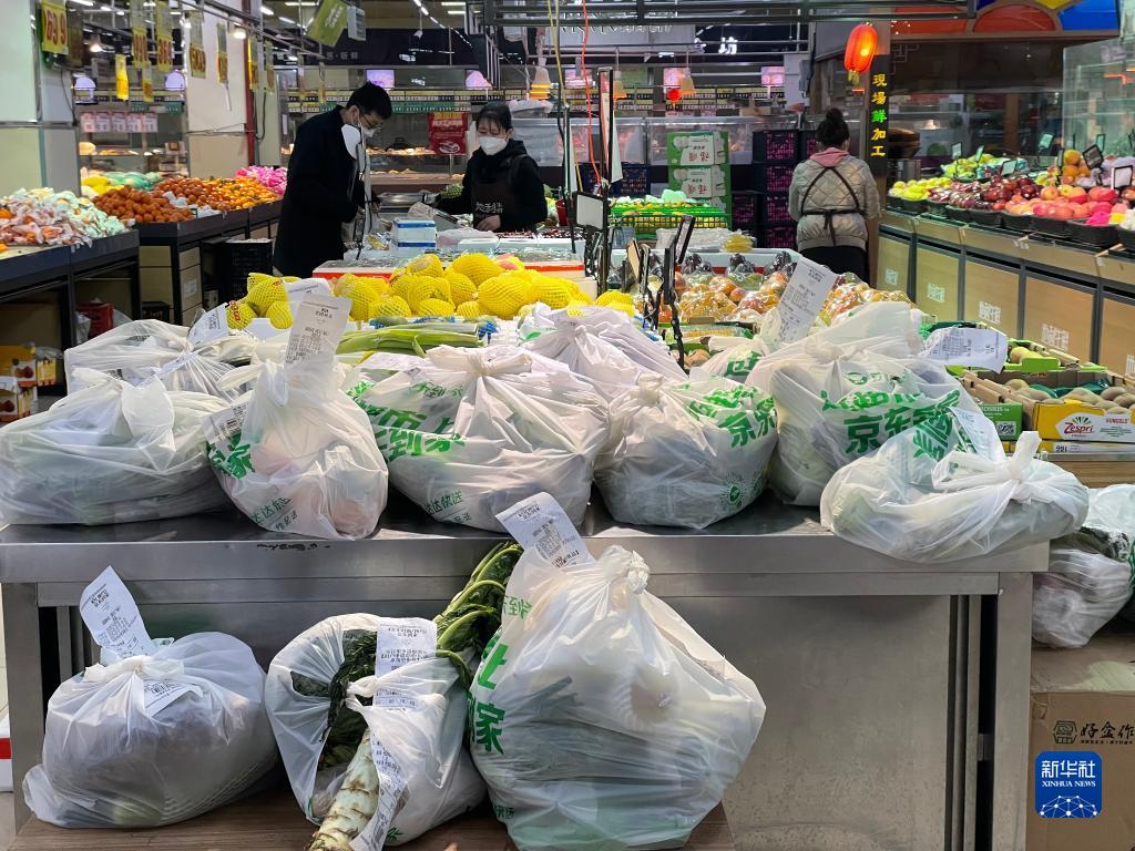 3月30日,沈阳市的一家商超内等待取走的各类蔬果外卖订单(手机照片)。