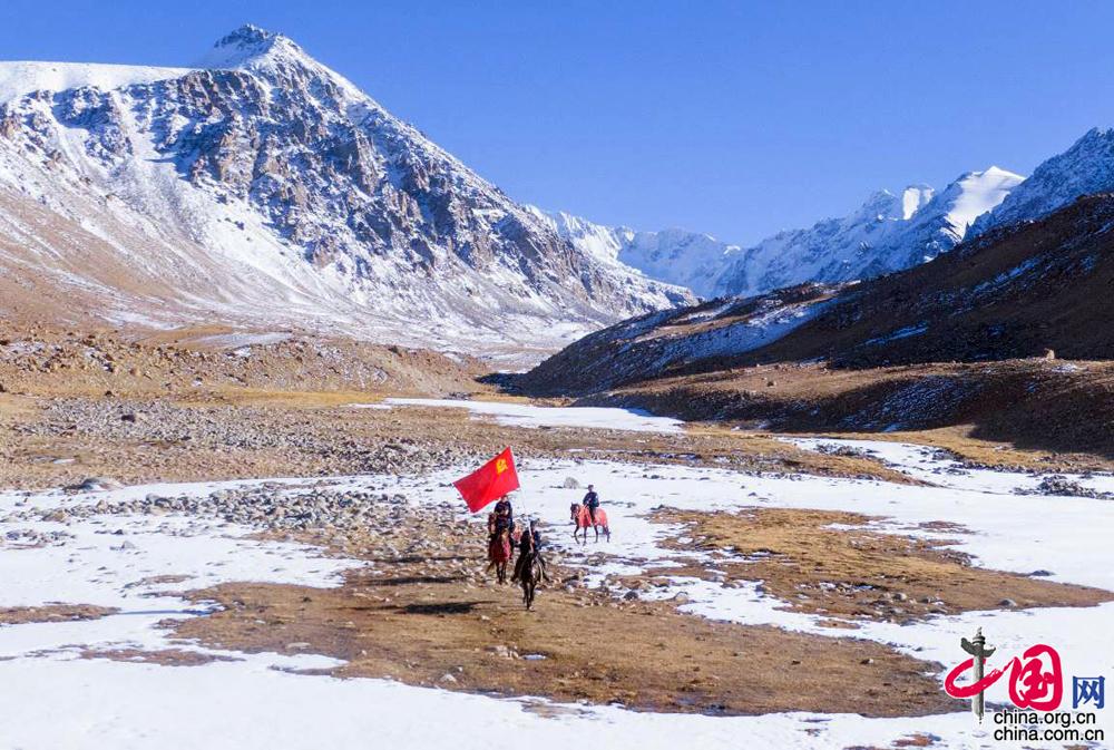 4月1日,新疆喀什边境管理支队红其拉甫边境派出所青年党员民警擎旗策马,再走巡边路。 王九峰 摄