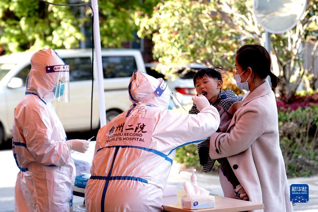 4月4日,在上海松江区祥欣居民区,浙江援沪医疗队队员为小朋友进行核酸检测采样。
