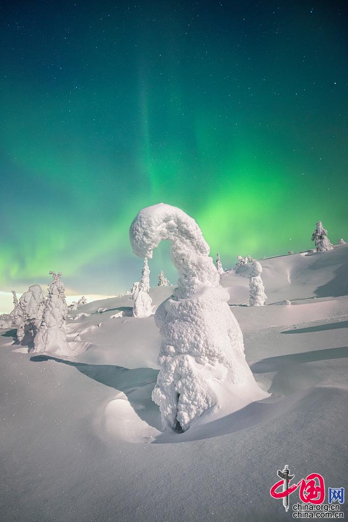 当地时间2022年4月6日,俄罗斯摩尔曼斯克,科拉半岛现“雪树”景观,缤纷北极光在上空舞动,宛如神话世界。图片作者:Anadolu Agency/视觉中国