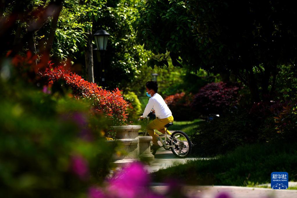 4月12日,在上海松江区洞泾镇被列入防范区的一个小区内,一名孩子在骑车玩耍。