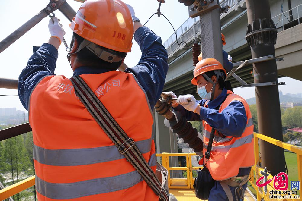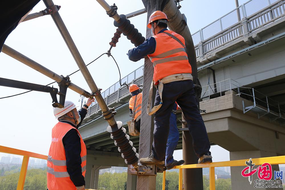 4月11日,在京沪铁路南京长江大桥上,中铁电气化局运管公司上海维管处南京维管段的接触网工们像往常一样,登上大桥下层的铁路桥,在线路上紧张穿梭,对大桥要害部位的接触网关键设备进行全面“把脉诊疗”。