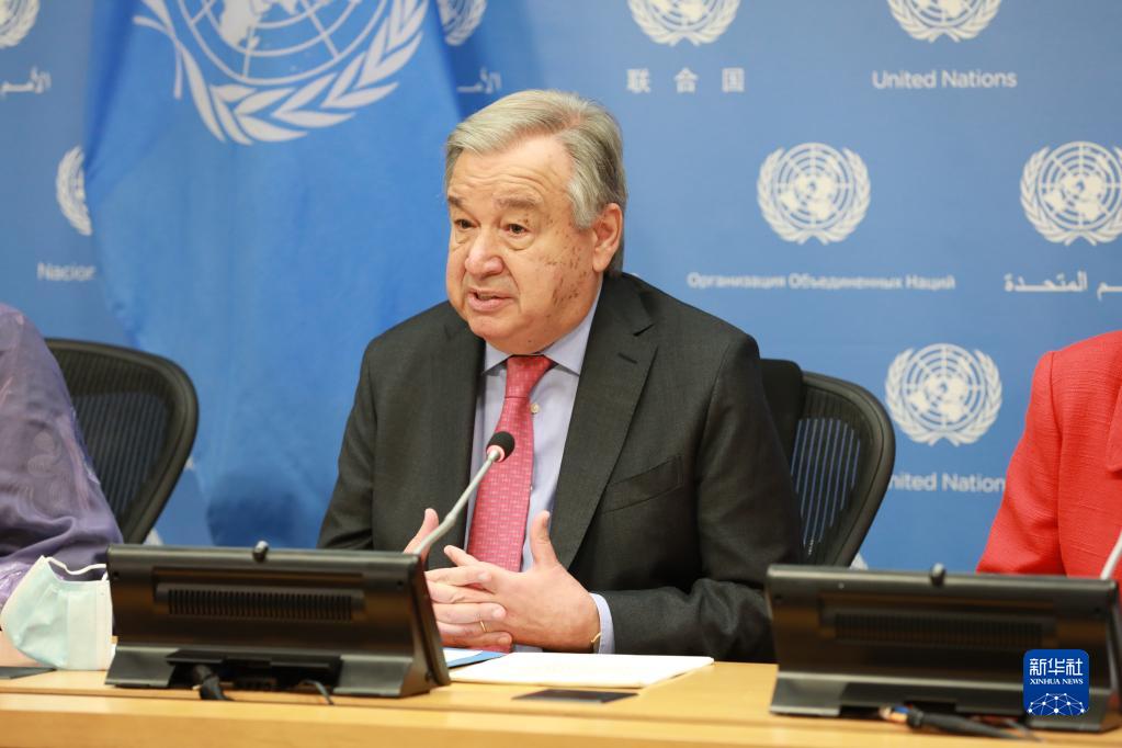 4月13日,在位于纽约的联合国总部,联合国秘书长古特雷斯在全球粮食、能源和金融危机应对小组针对乌克兰冲突发布政策简报的记者会上讲话。