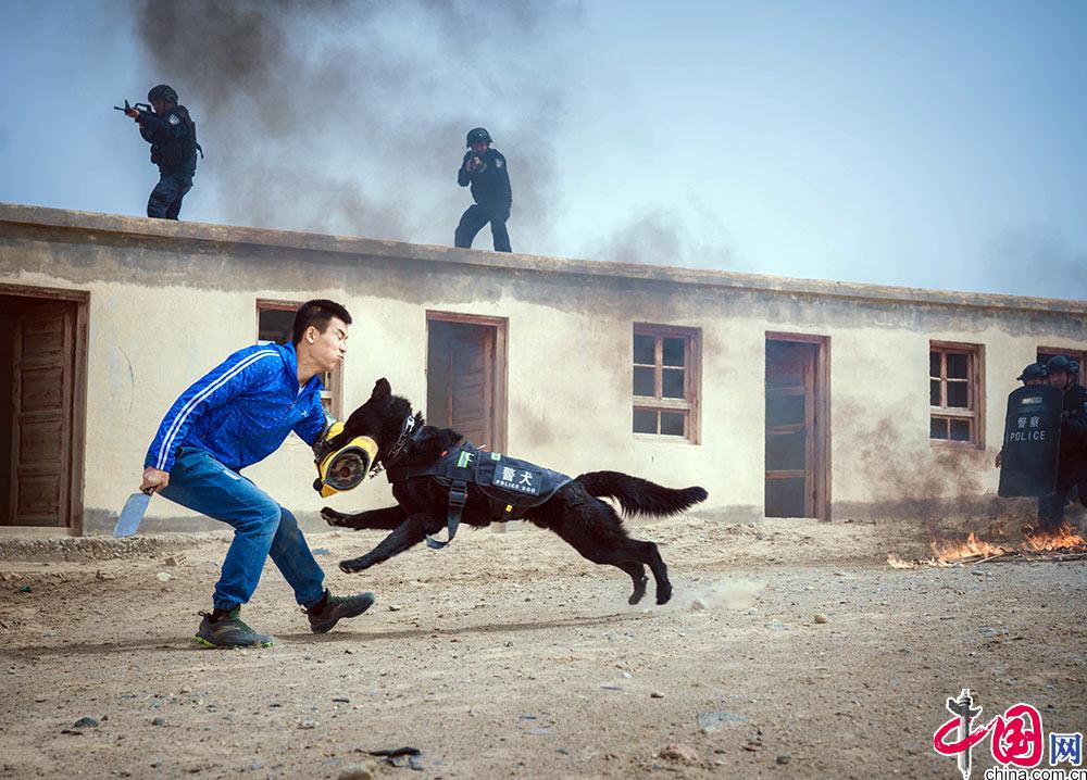 4月21日,新疆出入境边防检查总站喀什边境管理支队棋盘边境检查站协同该支队警犬基地开展实战演练。 图为模拟警犬协调战斗小组抓捕犯罪嫌疑人。 王九峰摄
