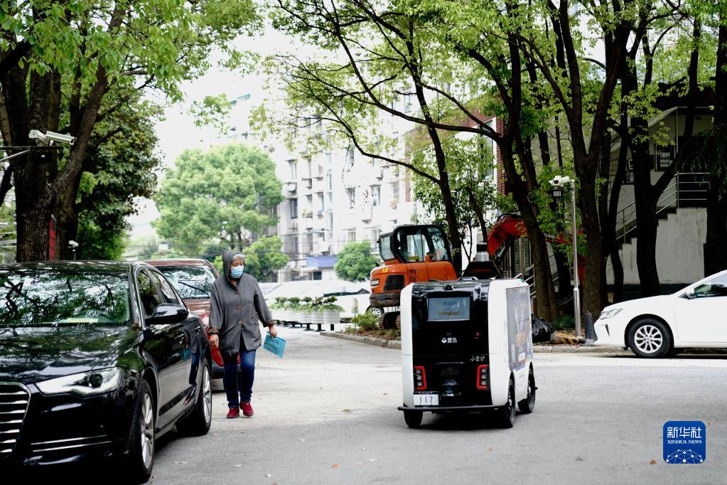 这是4月25日在杨浦区长海路街道浣纱小区内拍摄的无人快递车。