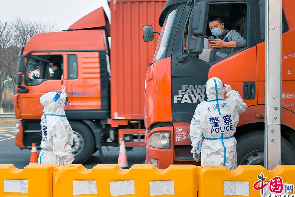 2月22日, 由于高速管控实行管控,苏州工业园区交警大队辅警黄靖雅、杨玉燕在沪宁高速园区出入口检查苏城码。嘉诚摄影