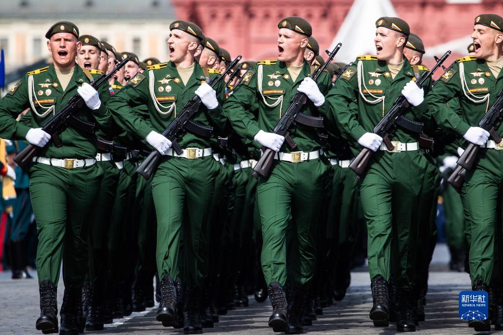 5月7日,在俄罗斯首都莫斯科,士兵列队走过红场。