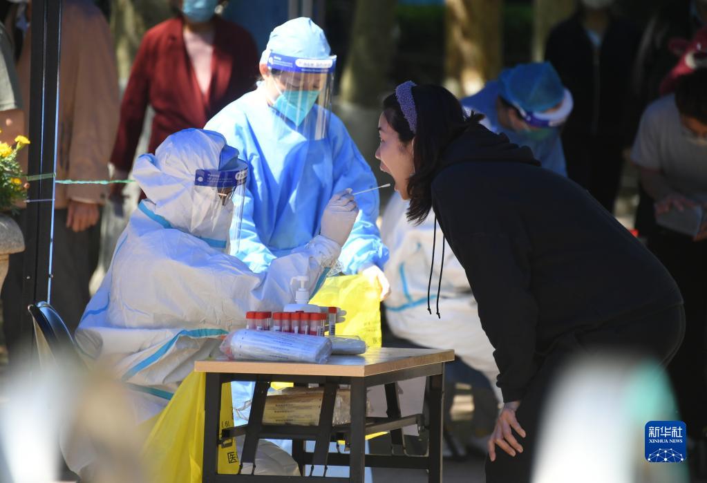 5月14日,在北京市海淀区北太平庄街道天兆家园社区,医护人员(左一)为社区居民进行核酸采样。