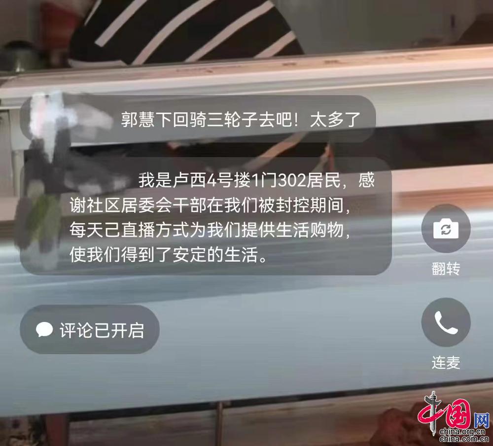 中国网讯(通讯员 张静惠 色珍)“4-1-502要3条黄瓜、3个西红柿”“4-2-102订5斤鸡蛋”“4-2-202苹果5个梨3个……”最近,丰台区长辛店街道东山坡社区卢西嘉园小区4号楼的居民微信群很热闹,每隔一天,群里都会开展一场“直播带货”。“主播”兼“跑腿儿员”是东山坡社区的工作人员郭慧、孙佳,手机前“点单”的“观众”则是居家隔离的卢西嘉园小区4号楼的居民。