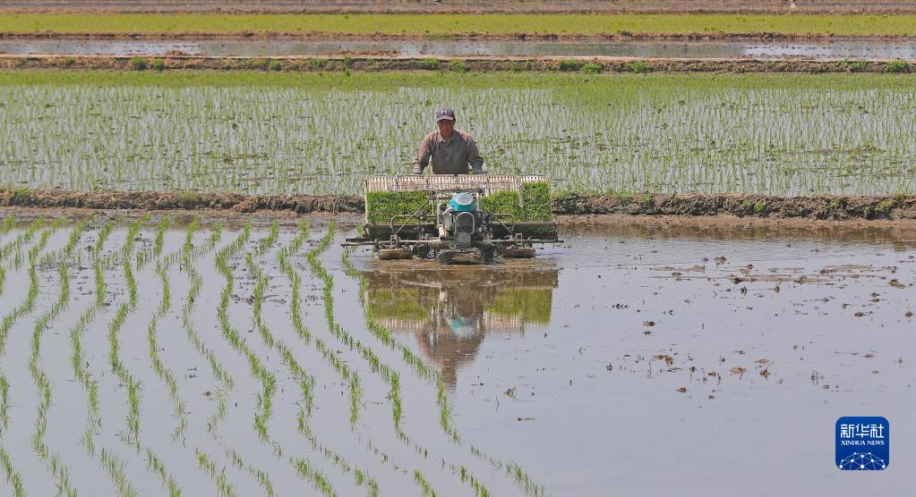 5月18日,在沈阳市沈北新区兴隆台街道,农民使用农机在稻田里插秧。