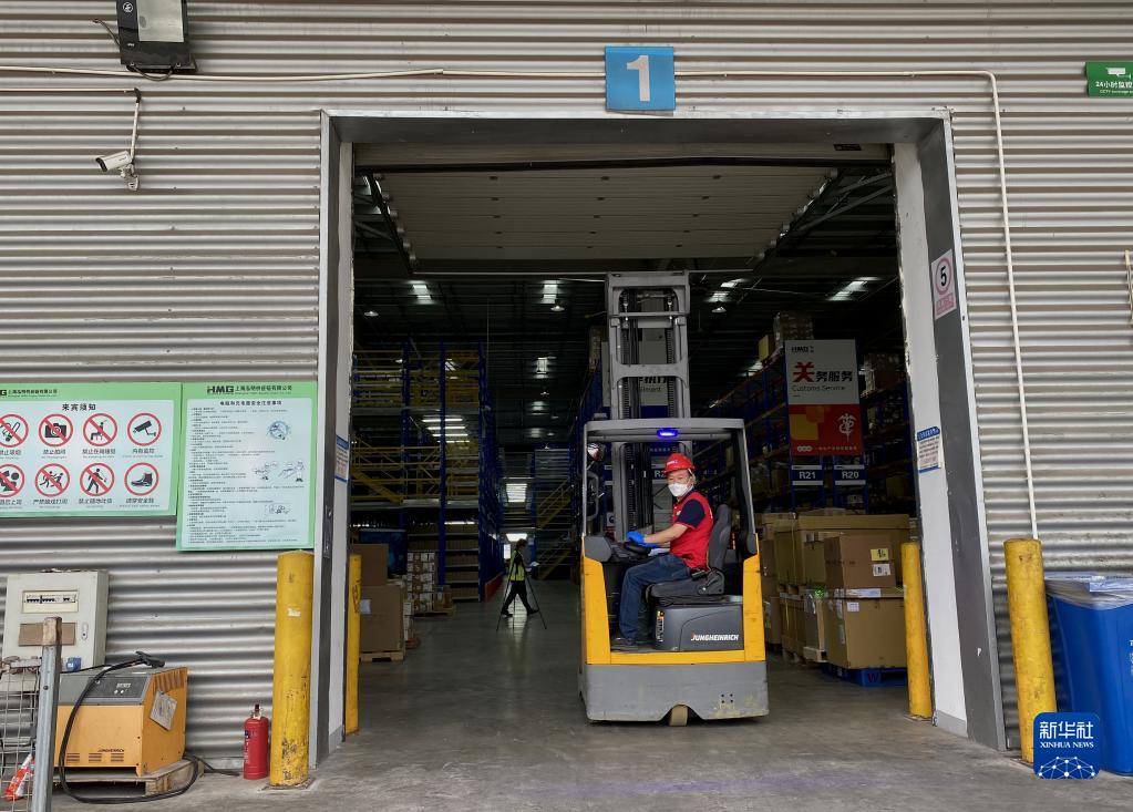 5月20日,在上海泓明供应链分拨中心,工人开动叉车运送进口的集成电路零部件。