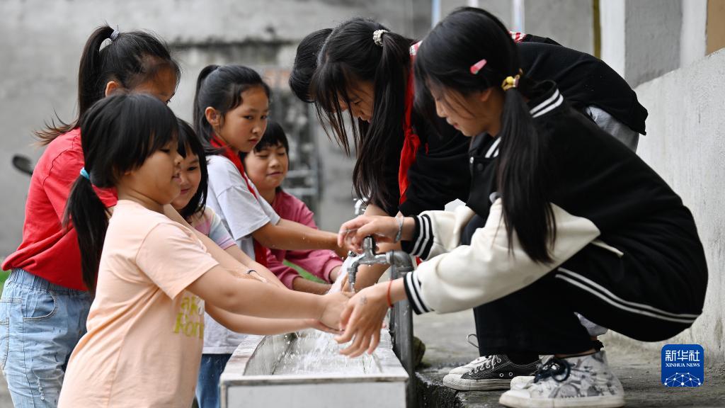 在广西融水苗族自治县东阳村小学,学生们在午饭前洗手(5月19日摄)。