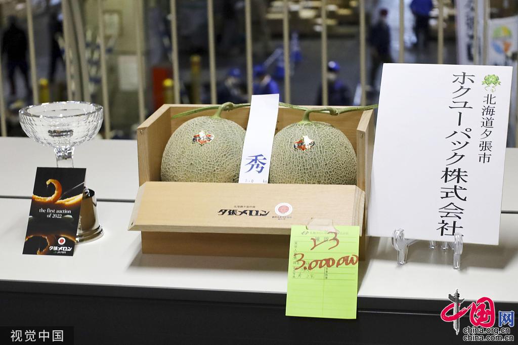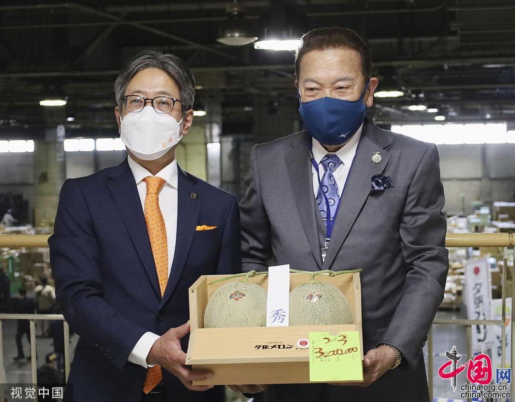当地时间2022年5月26日,日本札幌,当地举行甜瓜(Yubari melon)拍卖,以300万日元(158700人民币)的价格成交。图片作者:Kyodo News/视觉中国