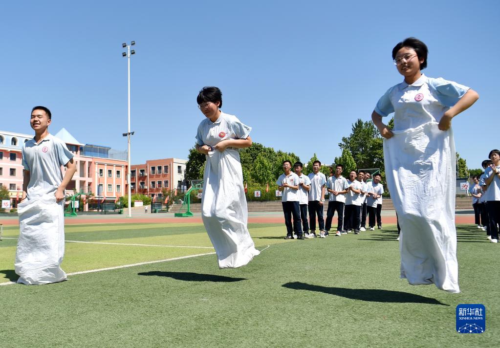 5月26日,河北赵县中学高三学生在做“袋鼠跳”游戏,缓解备考压力。