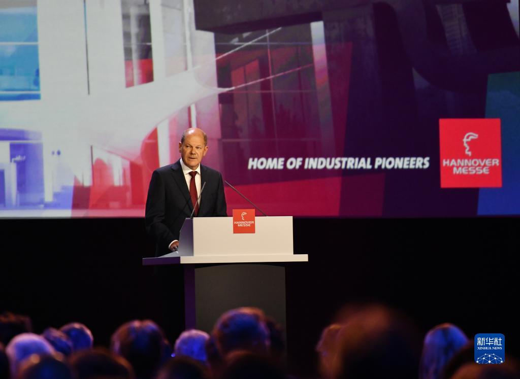 5月29日,德国总理朔尔茨在汉诺威工业博览会开幕式上致辞。