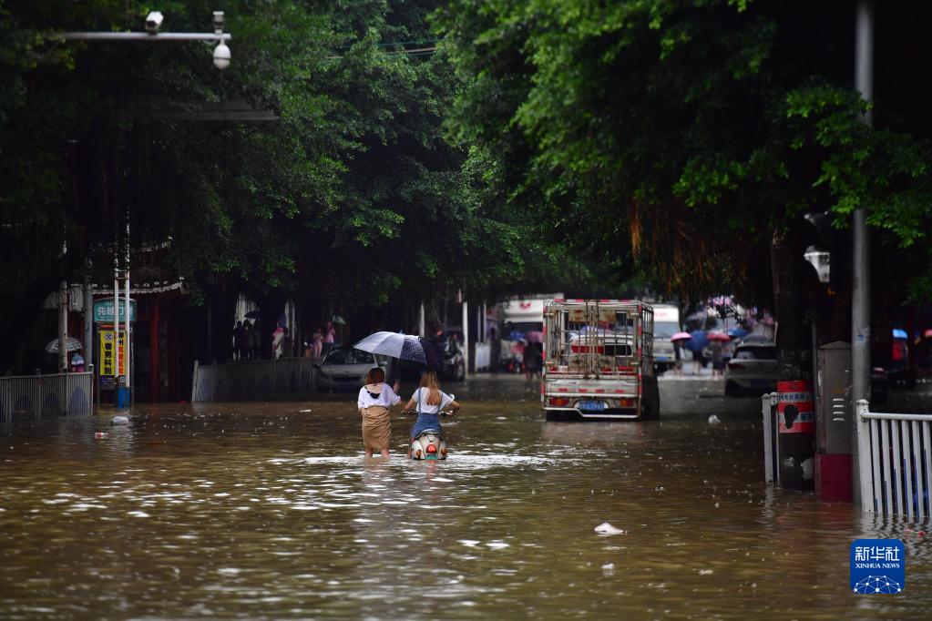6月5日,在广西融水苗族自治县县城,居民在积水的街道上行走。