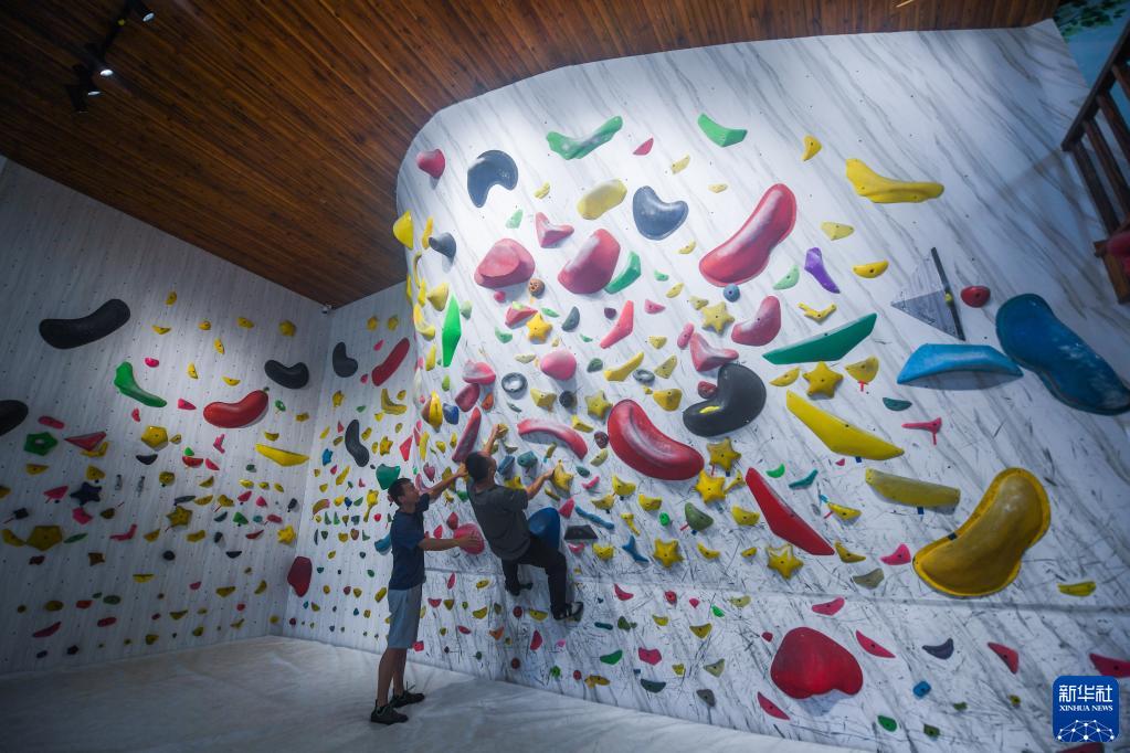 6月7日,游客在杭州市临安区高虹镇“龙门秘境”村落景区内的攀岩馆体验攀岩。