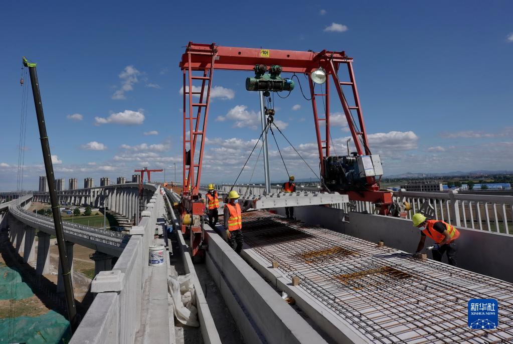 6月7日,工人在唐山市高新技术开发区境内的京唐城际铁路建设工施工。