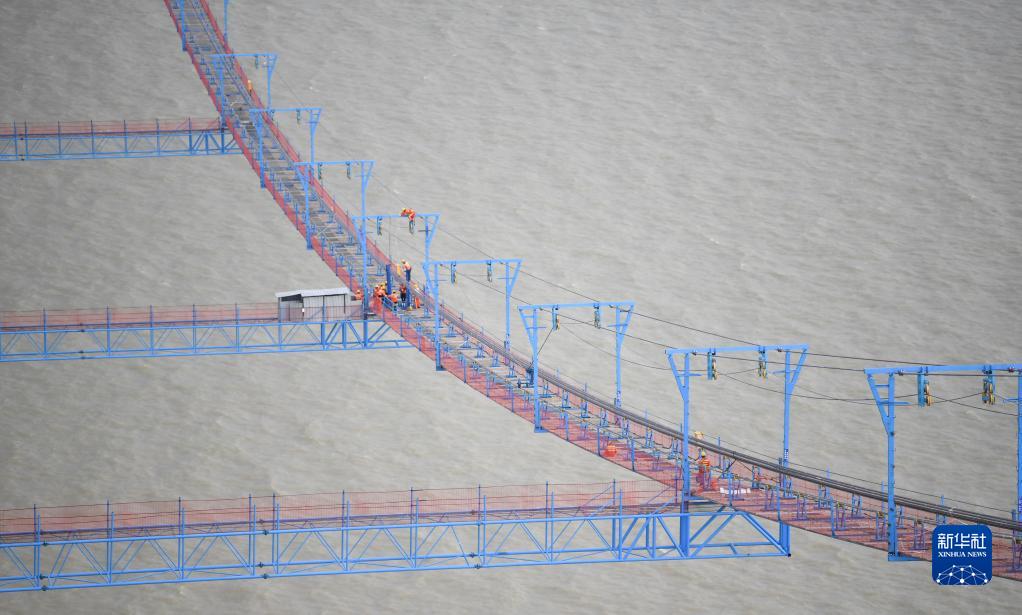工人在深中通道伶仃洋大桥海上施工猫道上作业(6月7日摄)。