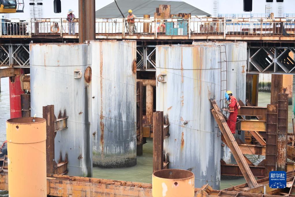 工人在深中通道西人工岛上施工作业(6月7日摄)。
