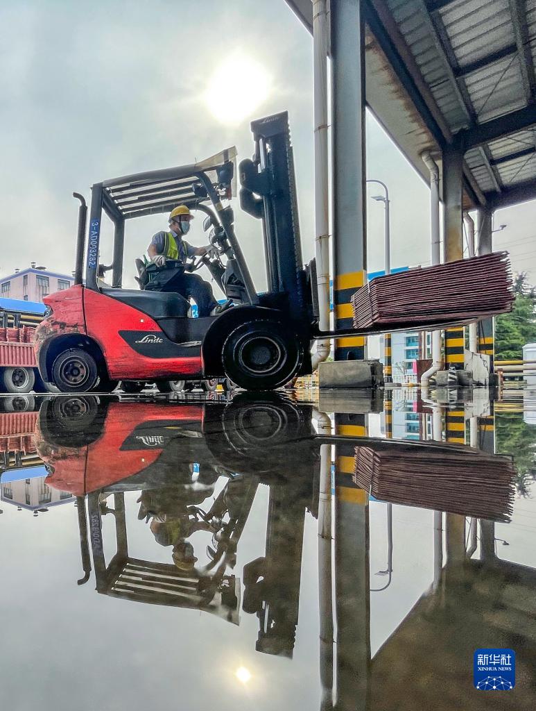 6月9日,在位于江苏省常州市天宁区的常州金源铜业有限公司,工人在运输货物。