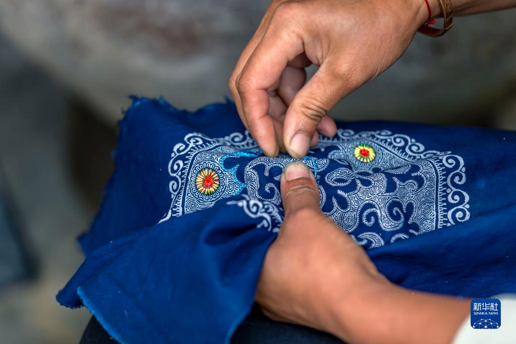 6月10日,在贵州省黔西市新仁苗族乡化屋村,村民在制作苗绣。