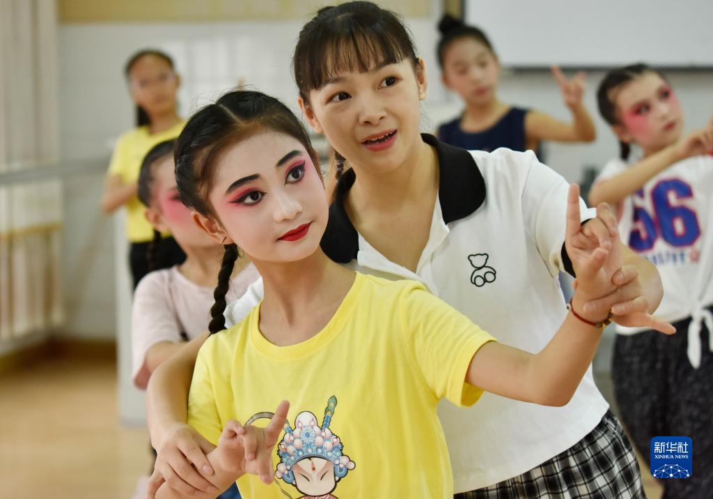 6月10日,在浙江省武义县新宅小学,戏曲老师向小朋友传授婺剧表演基本功。